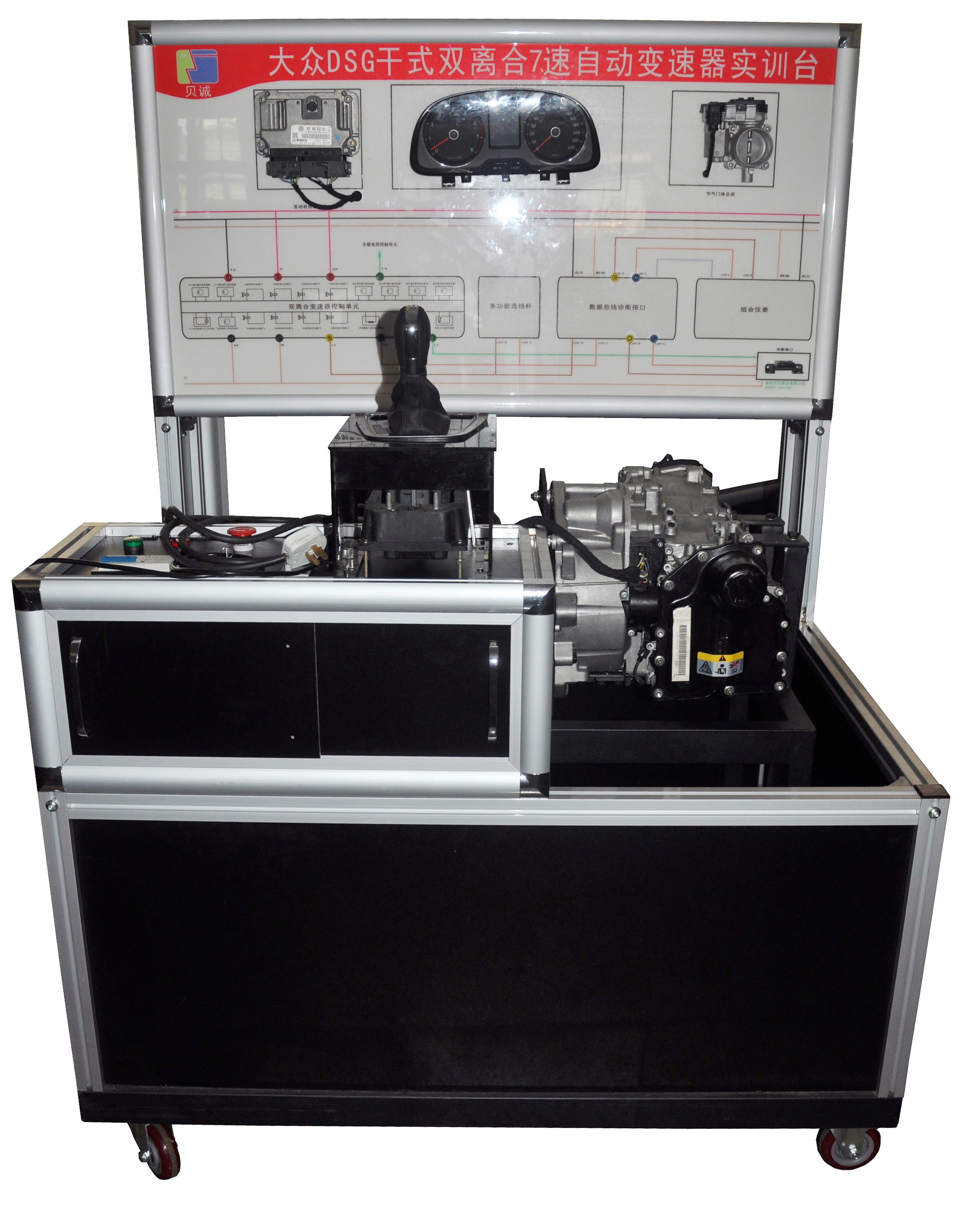 2、通過原廠的換擋裝置對變速器實訓(xùn)臺進行操作;通過調(diào)速電機模擬發(fā)動機轉(zhuǎn)速;通過可調(diào)節(jié)電位計模擬車速;通過鉗盤制動系統(tǒng)對變速器加載