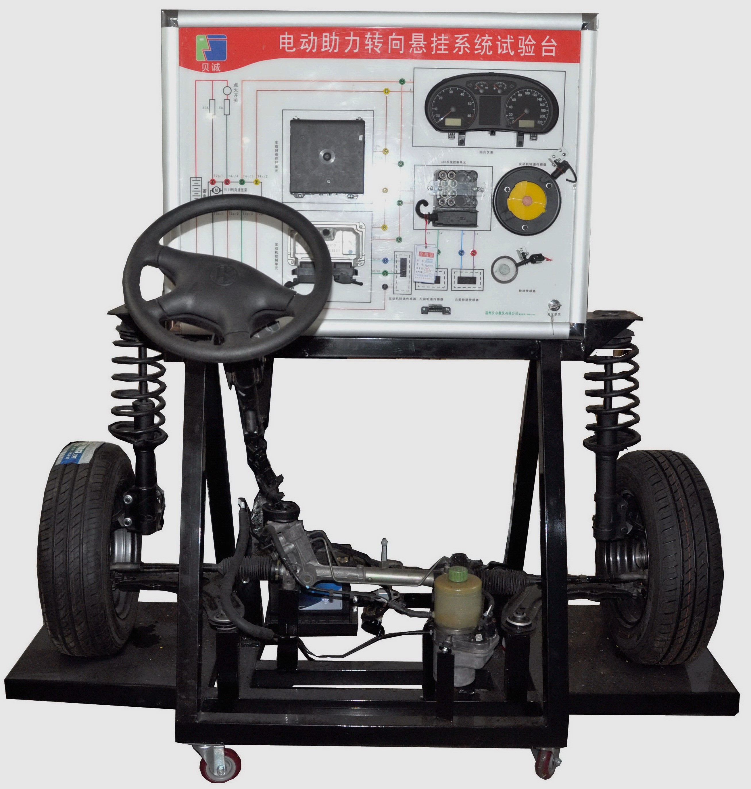 1、配置包括:方向盤、方向機、前懸掛系統(tǒng)、車輪、轉(zhuǎn)向盤、電控助力轉(zhuǎn)向系統(tǒng)控制單元ECU、扭矩傳感器、扭矩傳感器參考電壓顯示屏、組合儀表、起動開關(guān)、車速模擬裝置、測量面板、故障設(shè)置系統(tǒng)和移動支架