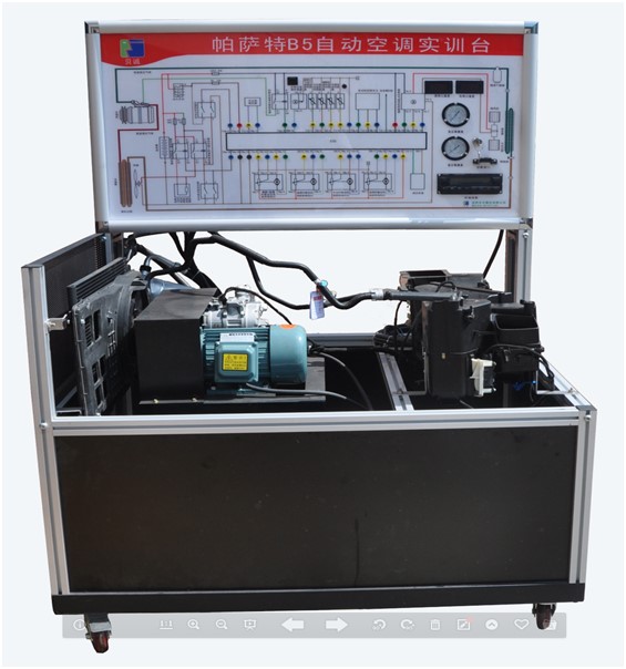 2、通過(guò)原廠自動(dòng)空調(diào)實(shí)訓(xùn)臺(tái)進(jìn)行操作,通過(guò)驅(qū)動(dòng)電機(jī)模擬發(fā)動(dòng)機(jī)驅(qū)動(dòng)空調(diào)壓縮機(jī)工作,通過(guò)自動(dòng)個(gè)空調(diào)控制面板驅(qū)動(dòng)蒸發(fā)箱各風(fēng)道口私服電機(jī)工作